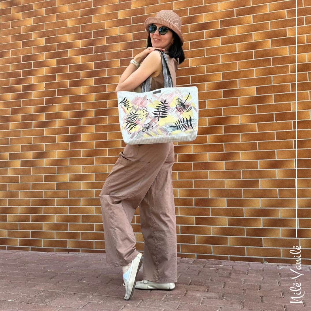 Pirkinių krepšiai siuvami iš tvirto audinio – natūralaus džinso, gobeleno ar neperšlampančio sintetinio audinio. Krepšius dekoruoju tapydama teptuku tekstiliniais dažais. Klientams siūlau pagalvoti apie mėgstamą frazę ar citatą, kurią galiu užrašyti ant krepšio, kad jis taptų dar mielesnis ir labiau asmeniškas.