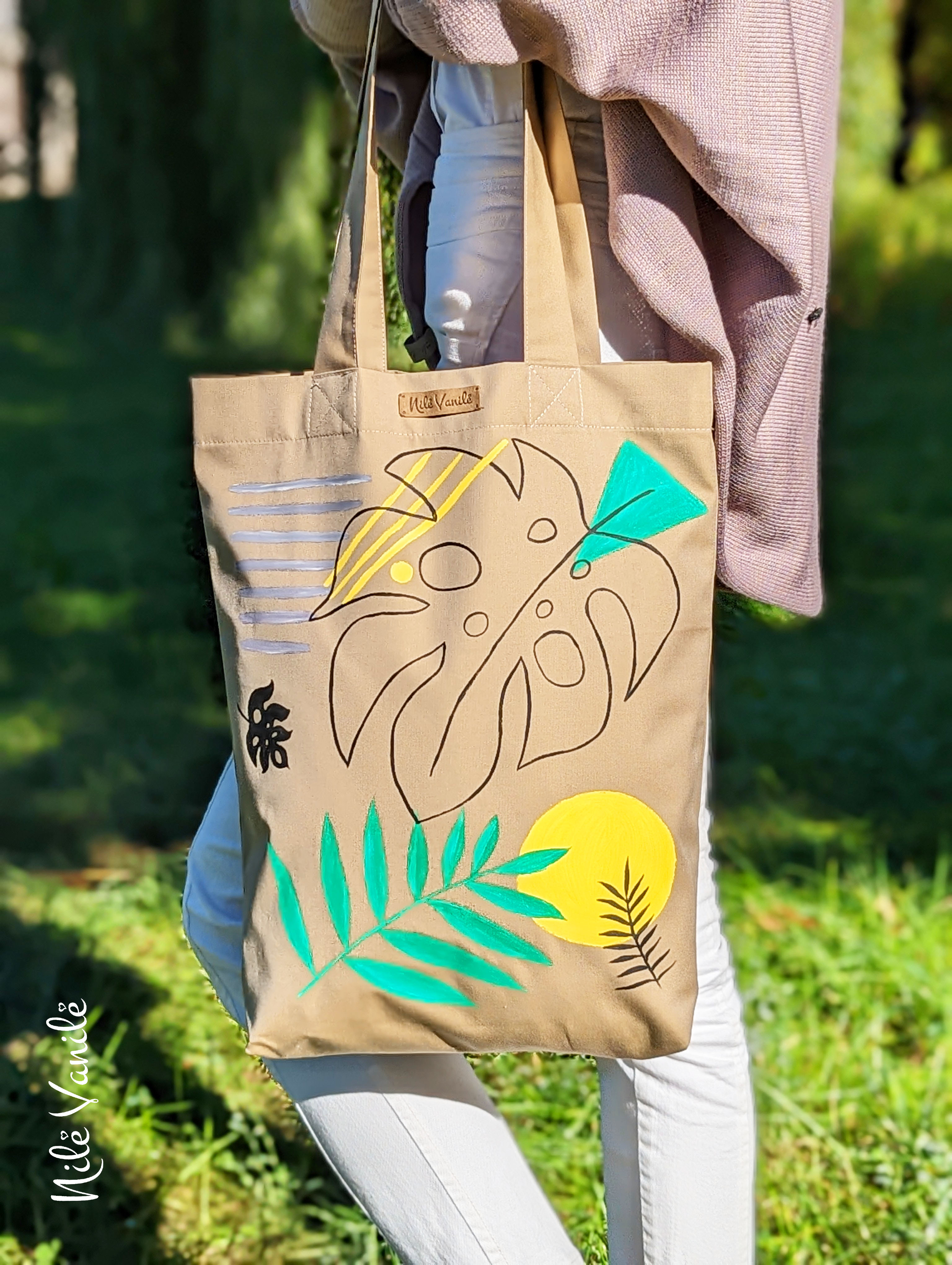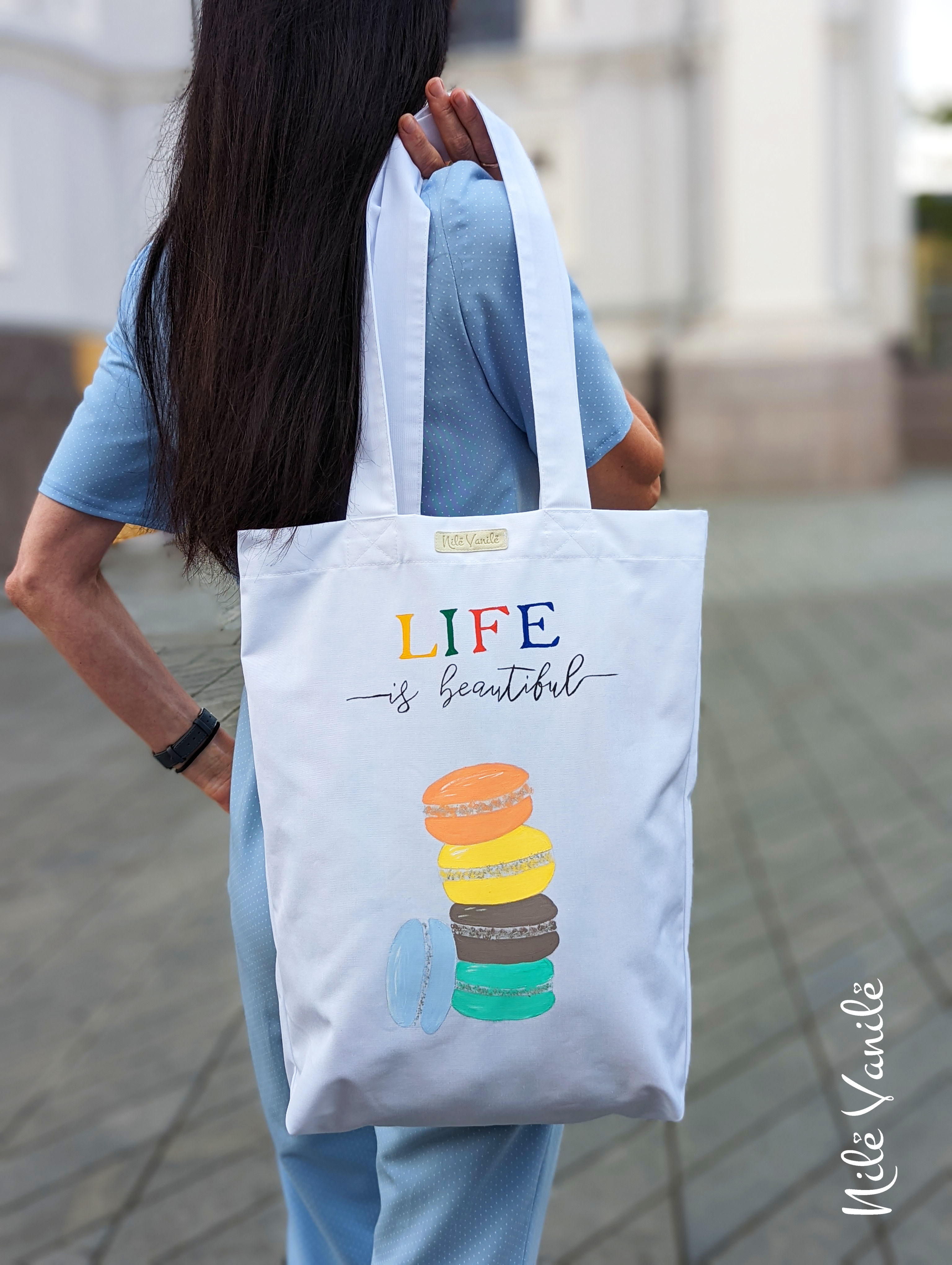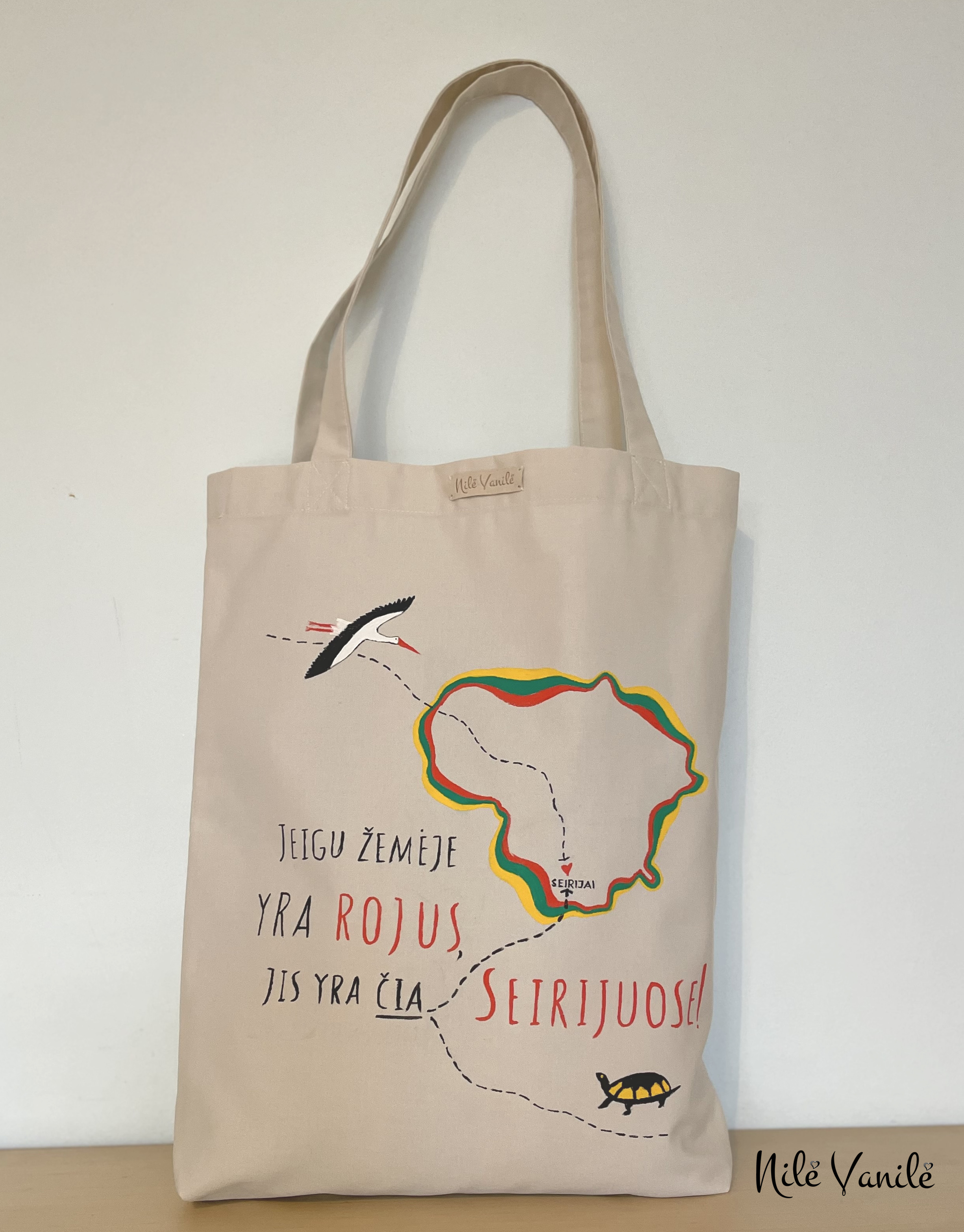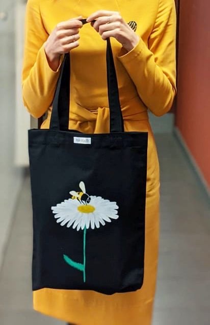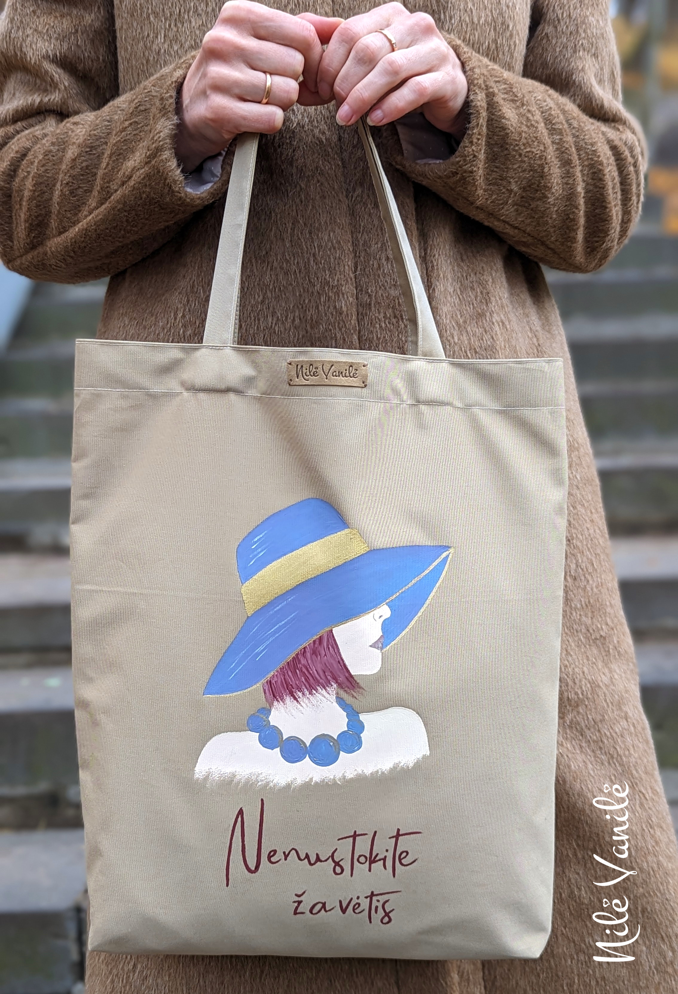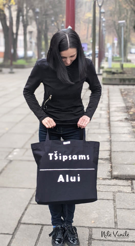 Pirkinių krepšiai siuvami iš tvirto audinio – natūralaus džinso, gobeleno ar neperšlampančio sintetinio audinio. Krepšius dekoruoju tapydama teptuku tekstiliniais dažais. Klientams siūlau pagalvoti apie mėgstamą frazę ar citatą, kurią galiu užrašyti ant krepšio, kad jis taptų dar mielesnis ir labiau asmeniškas.