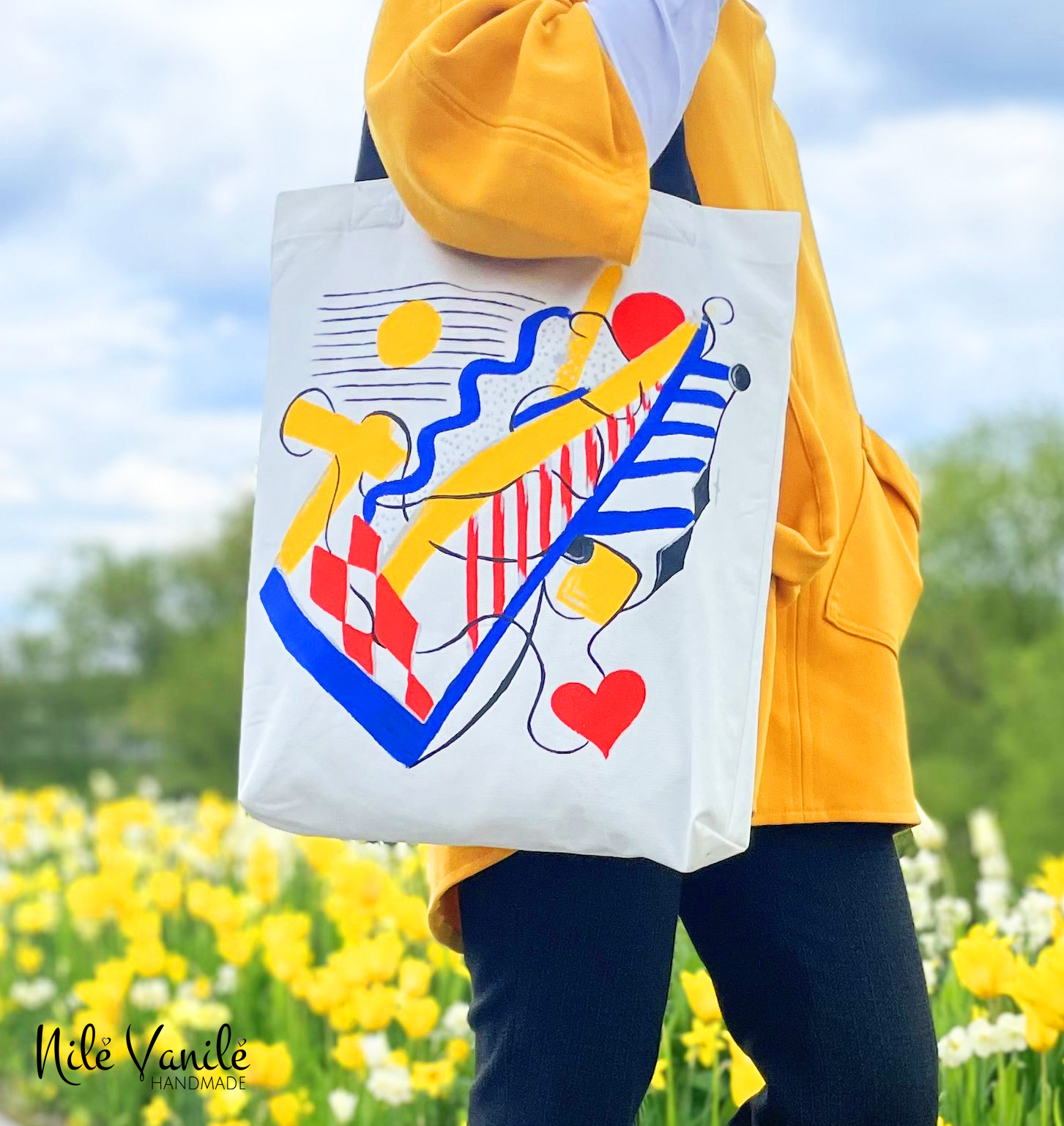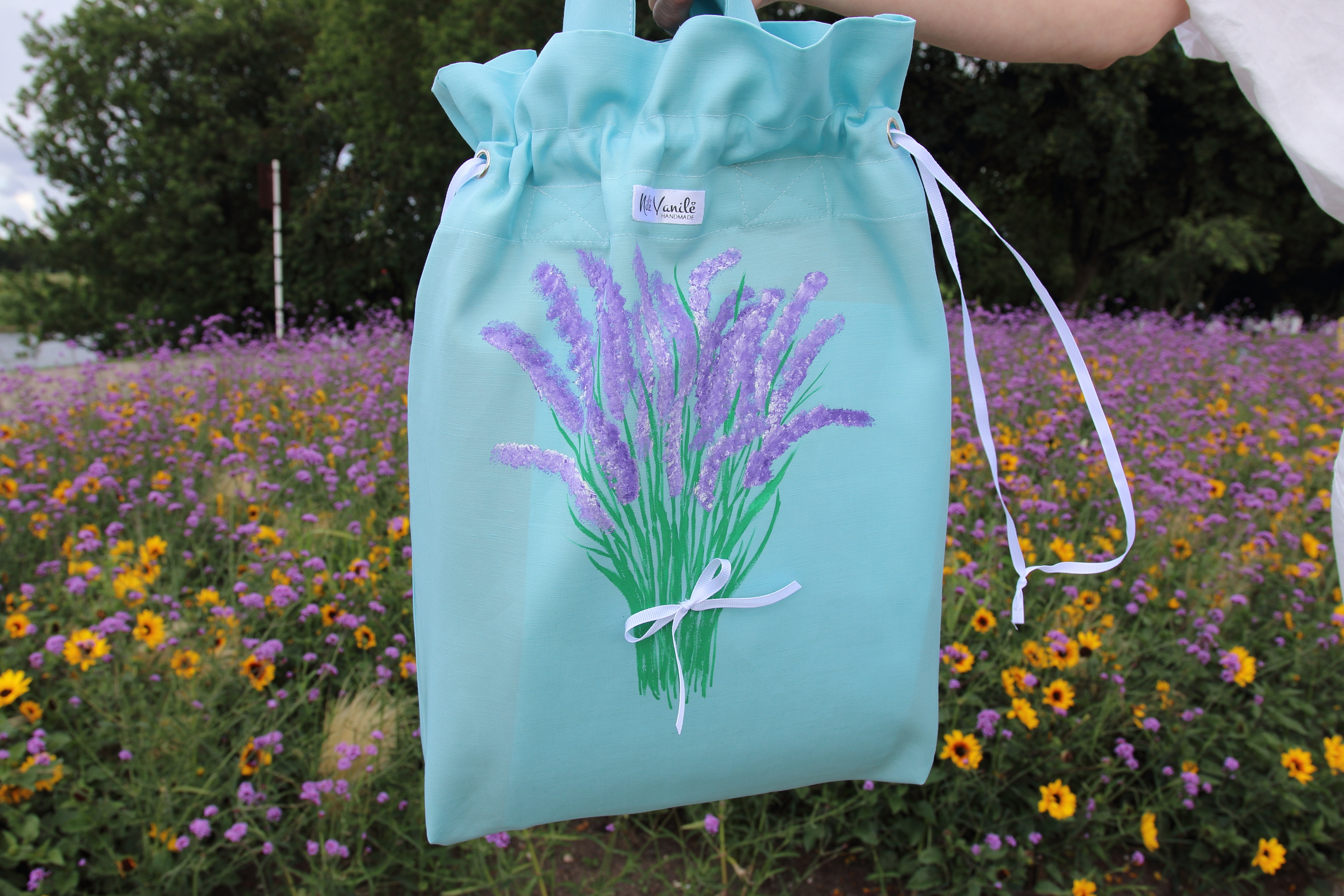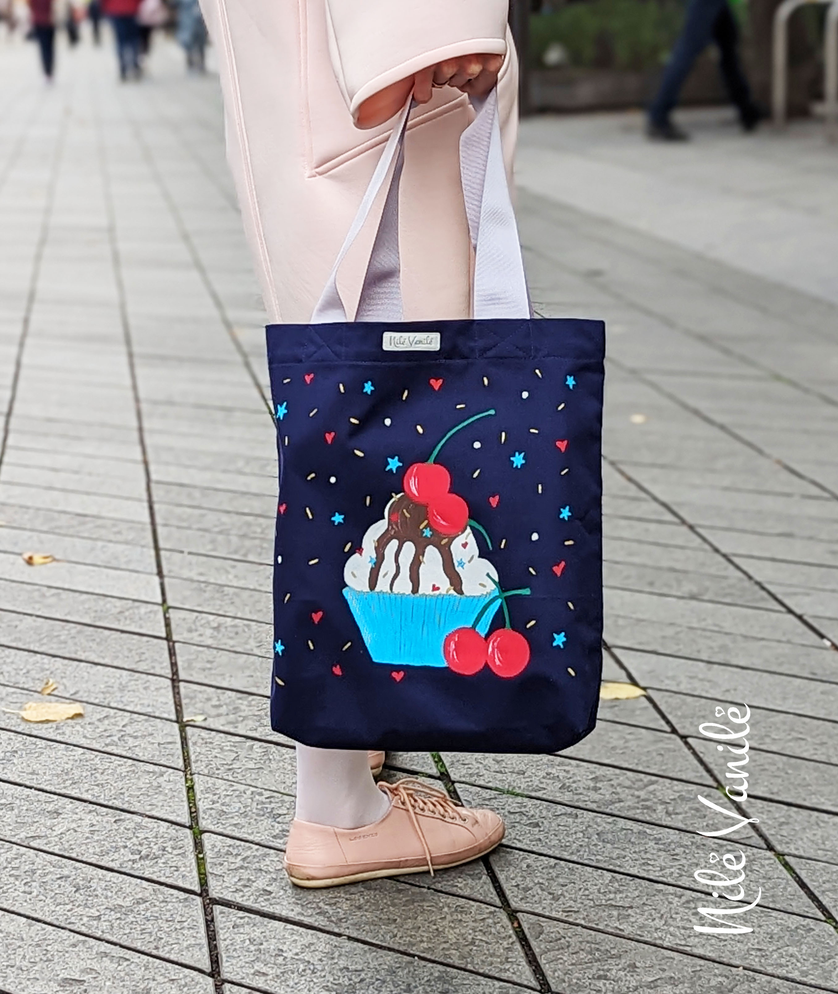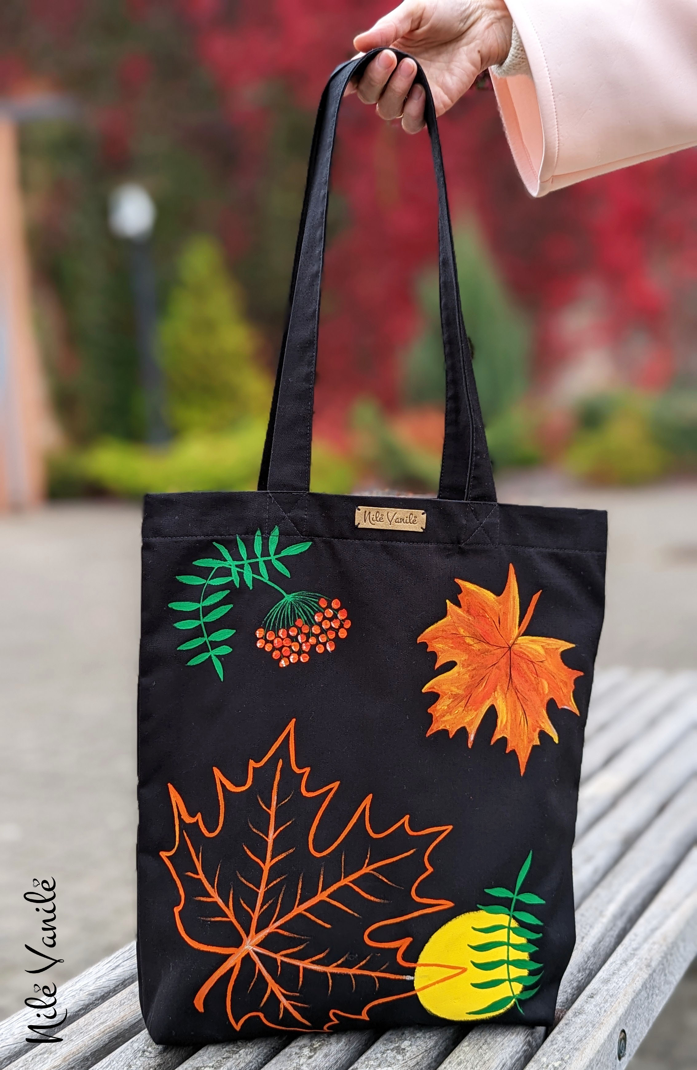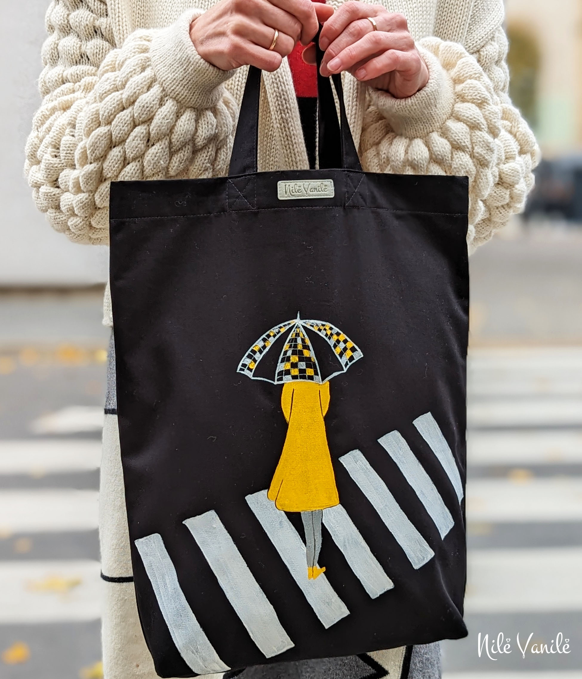 Pirkinių krepšiai siuvami iš tvirto audinio – natūralaus džinso, gobeleno ar neperšlampančio sintetinio audinio. Krepšius dekoruoju tapydama teptuku tekstiliniais dažais. Klientams siūlau pagalvoti apie mėgstamą frazę ar citatą, kurią galiu užrašyti ant krepšio, kad jis taptų dar mielesnis ir labiau asmeniškas.